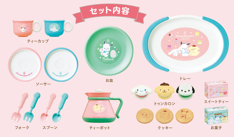サンリオキャラクターズのかわいいままごとです。お洒落な商品カラーに、かわいいパーツが入った、ティータイムセット。キャラクターたちのかわいいトゥンカロンやクッキーで楽しくティータイム。
